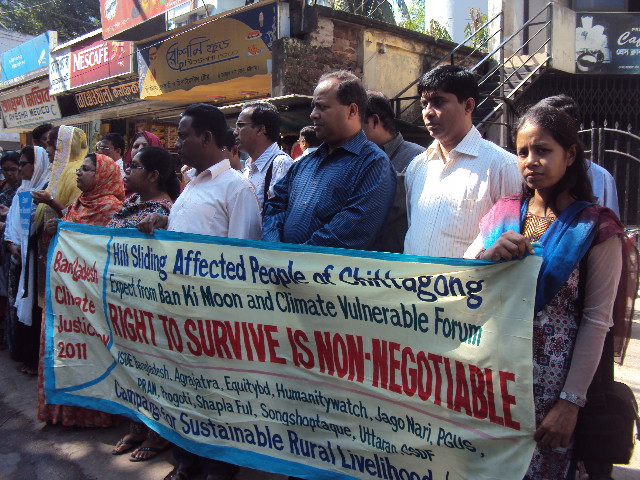 The principal demand from the peoples of Bangladesh to the international community reduce green house carbon gas by 2050 carbon gas must be reduced 95%. It also demands the losses to recover the rural livelihood from the developed nations and they have to compensate the affected countries. Otherwise affected nations will boycott the products from developed nations. These was stated on Human Chain on Climate Justice after gathering organized by ISDE Bangladesh with the associate of Campaign for Sustainable Rural Livelihoods-CSRL on 13th November 2011 at Chittagong Press Club Premises.